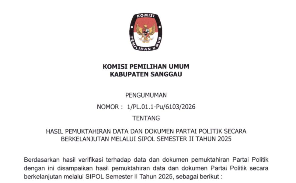 Sanggau, kab-sanggau.kpu.go.id I Berikut disampaikan pengumuman Komisi Pemilihan Umum Kabupaten Sanggau Nomor: Nomor: 1/PL.01.1-Pu/6103/2026 tentang Hasil Pemutakhiran Data Dan Dokumen Partai Politik Secara Berkelanjutan Melalui Sipol Semester II Tahun 2025