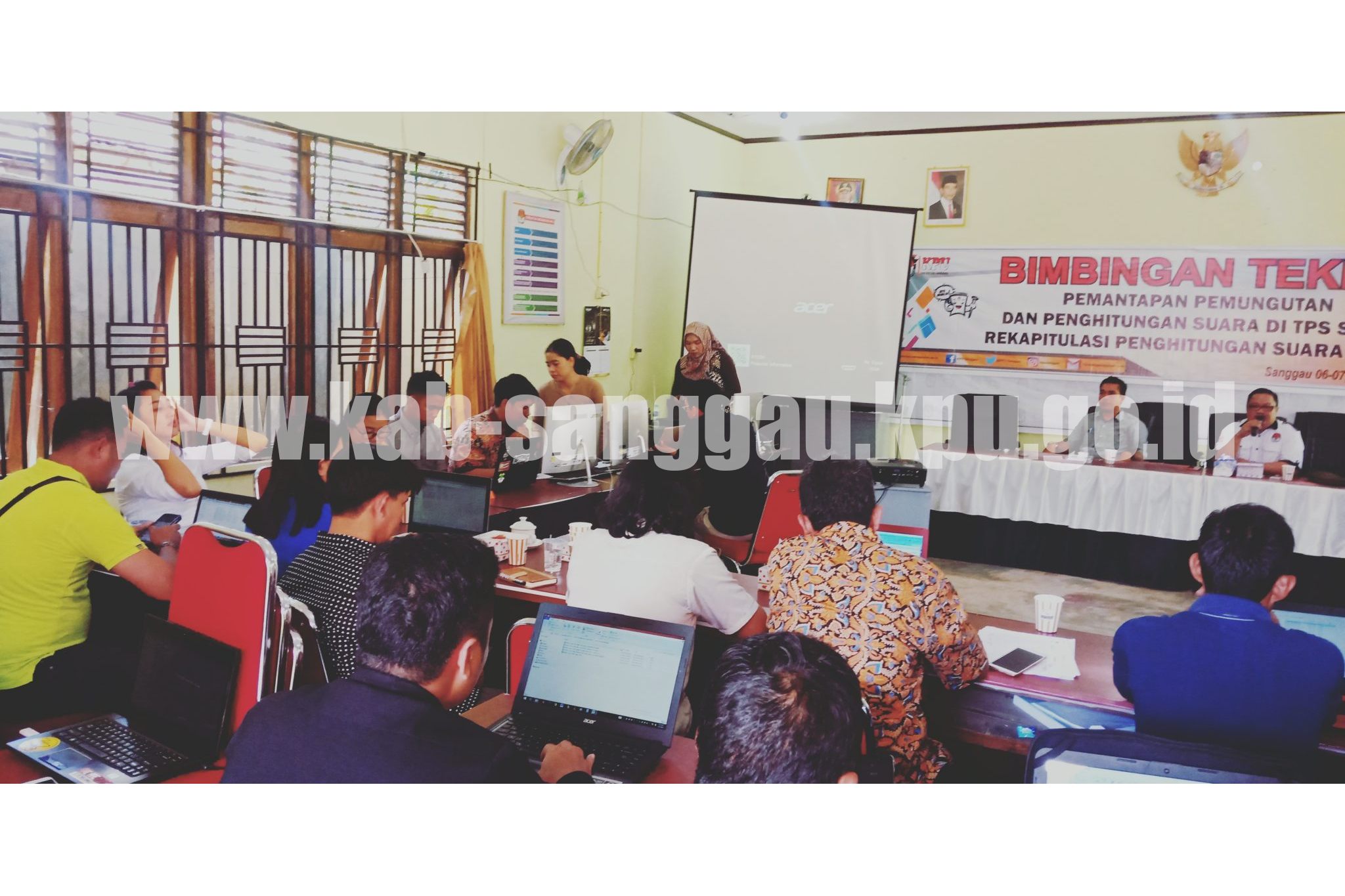 Para peserta merupakan anggota PPK yang ditunjuk untuk menjadi operator Situng, dibimbing mengenai teknis input data perolehan suara oleh Komisioner KPU Kabupaten Sanggau Divisi Teknis Penyelenggara, Iis Supianto didampingi Kasubbag Teknis dan Hupmas, Noviandha Satya Nugraha.