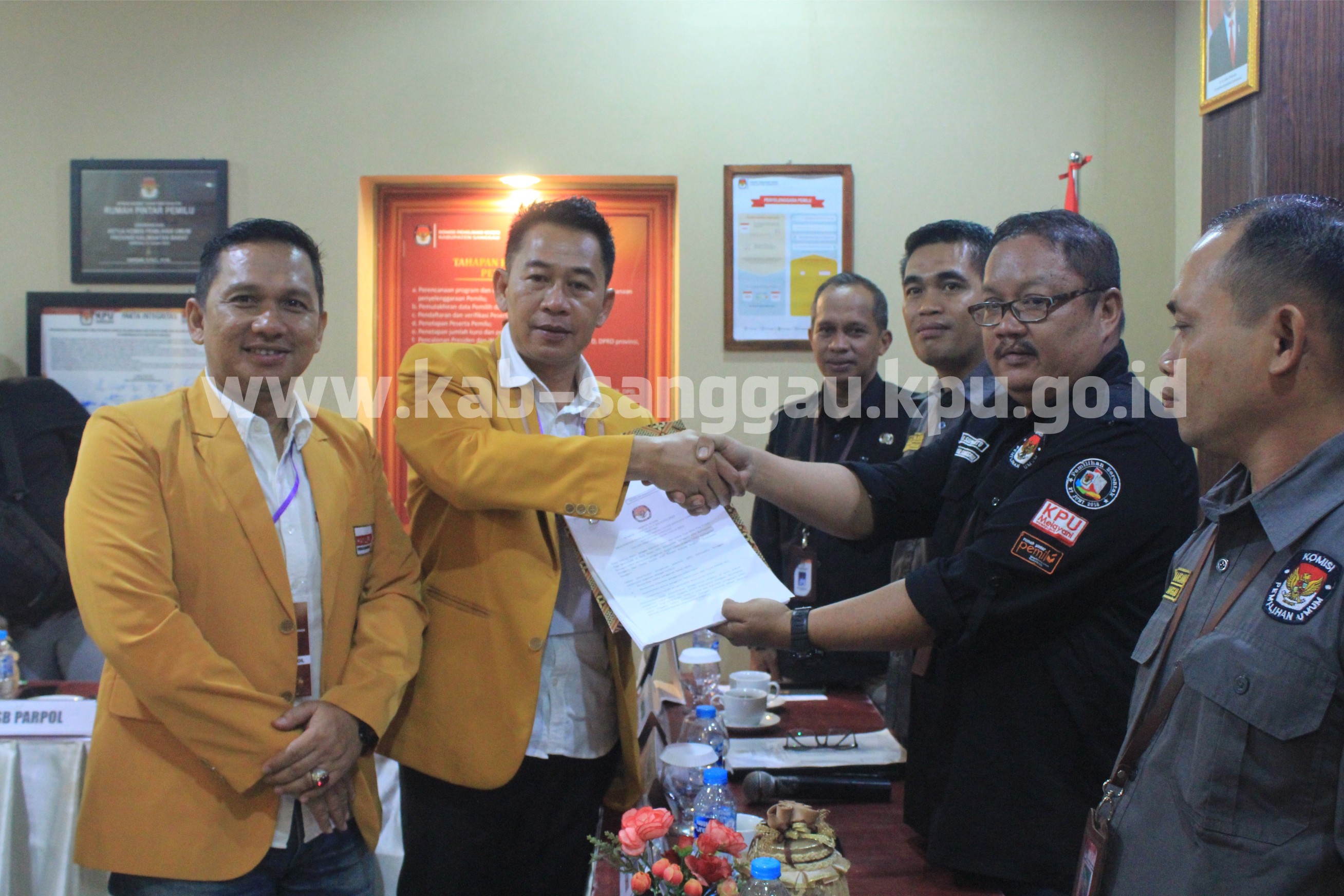Delegasi Partai diterima oleh Ketua KPU Kabupaten Sanggau Martinus Sumarto, Anggota KPU Kabupaten Sanggau Iis Supianto, Edy Rahmansana, Suwindari dan Vinsensius serta Sekretaris KPU Kabupaten Sanggau Andi Hasanuddin disaksikan oleh Bawaslu Kabupaten Sanggau bertempat di aula kantor KPU Kabupaten Sanggau.
