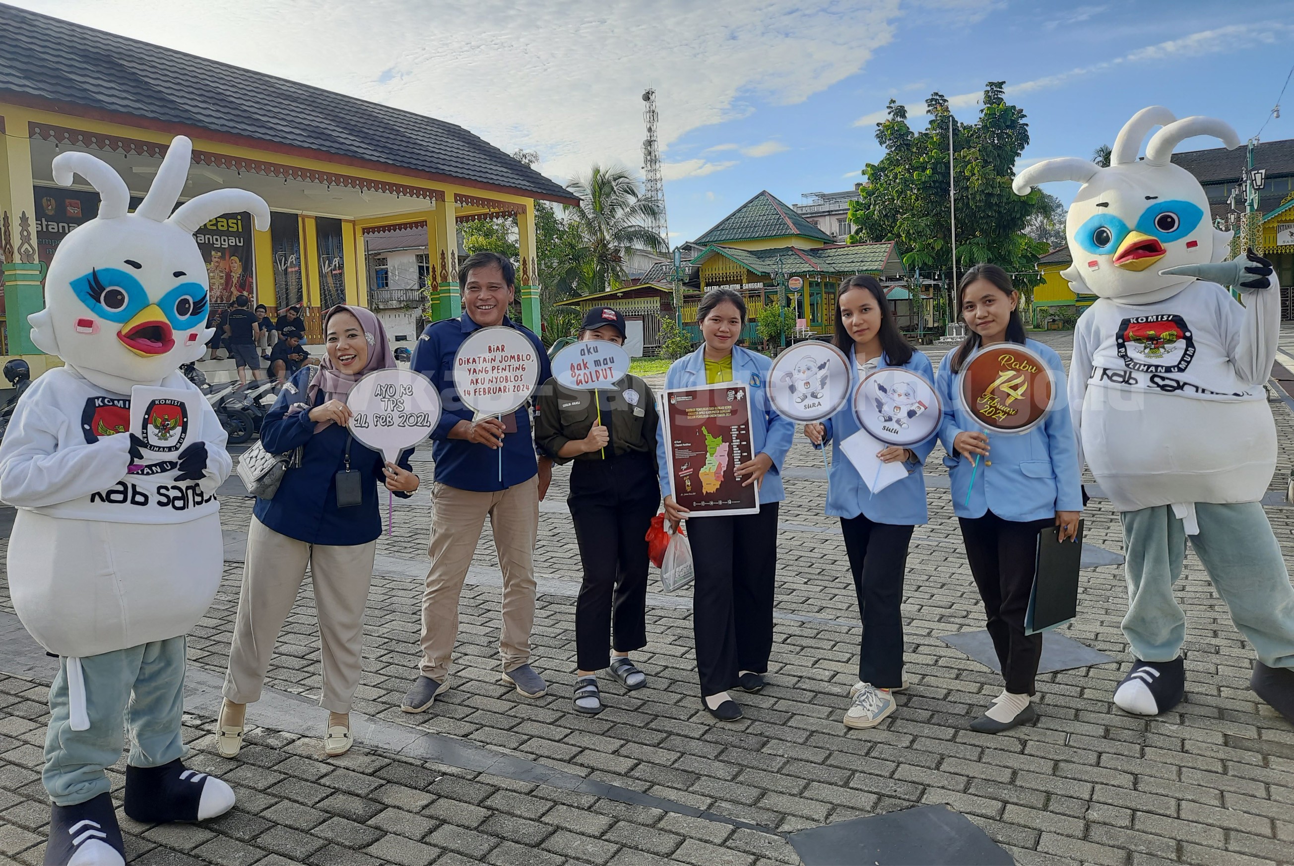 Kirab Pemilu Tahun 2024 dikemas dengan Sosialisasi dan Informasi tentang Tahapan Pemilu Tahun 2024 kepada masyarakat, dengan membagikan Souvernir berupa flyer informasi Pemilu Tahun 2024 dan Gantungan Kunci Pemilu Tahun 2024, Selasa (04/04). | Hupmas KPU Sanggau