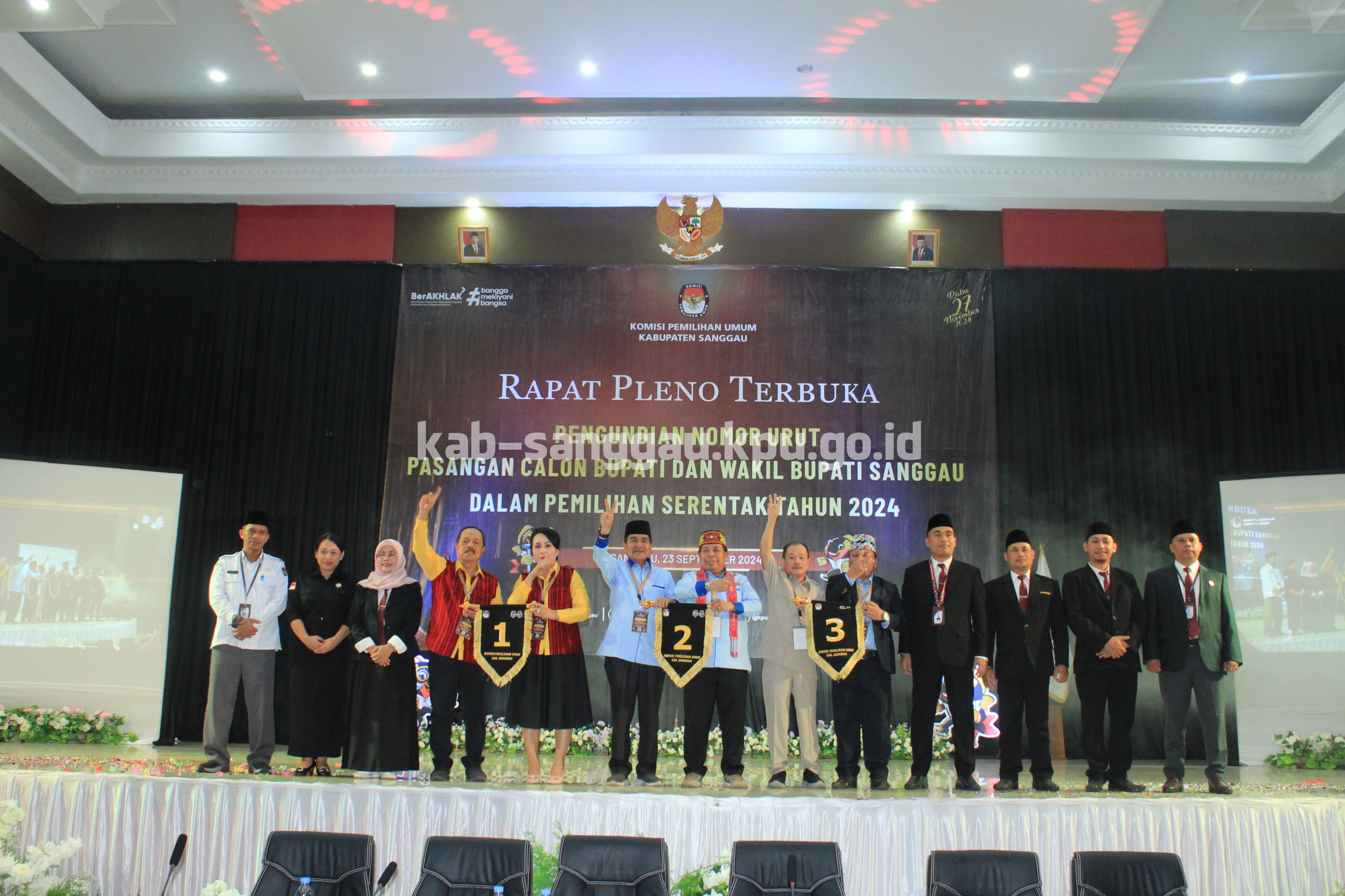 Sanggau, kab-sanggau.kpu.go.id I KPU Kabupaten Sanggau menggelar Rapat Pleno Terbuka Pengundian dan Penetapan Nomor Urut Pasangan Calon Bupati dan Wakil Bupati Sanggau dalam Pemilihan Serentak Tahun 2024, bertempat di gedung Balai Betomu Sanggau, Senin (23/09/2024) malam.