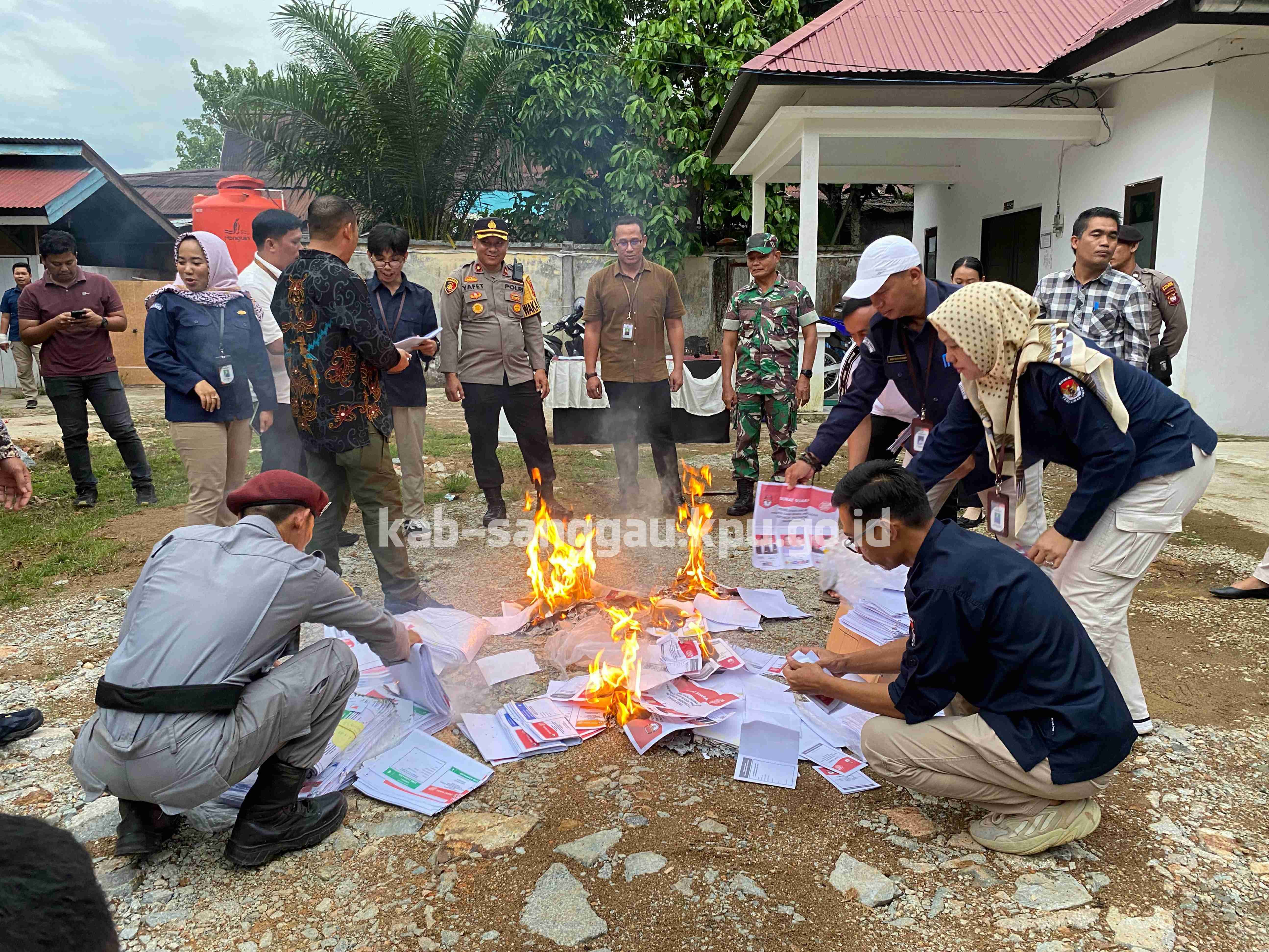 Sanggau, kab-sanggau.kpu.go.id | Berdasarkan Keputusan Komisi Pemilihan Umum Nomor 1395 Tahun 2023 tentang Pedoman Teknis Tata Kelola Logistik Pemilihan Umum, KPU Kabupaten Sanggau melaksanakan pemusnahan surat suara rusak dan surat suara yang melebihi jumlah kebutuhan pada Pemilu 2024 dengan cara dibakar, bertempat dihalaman belakang Kantor KPU Kabupaten Sanggau, Selasa (13/02/2024) sore.