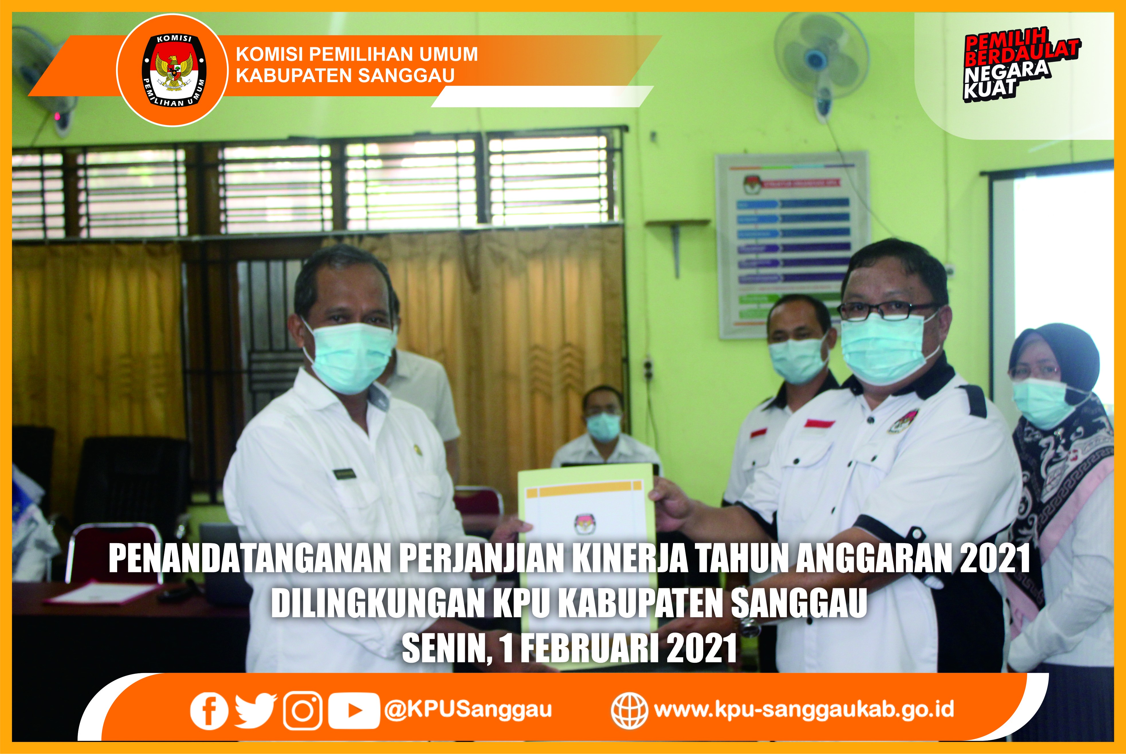 Sanggau, kab-sanggau.kpu.go.id | Penandatanganan Perjanjian Kinerja oleh Ketua, Anggota, Sekretaris, dan Kasubbag di lingkungan KPU Kabupaten Sanggau dilaksanakan Senin (01/02/2021) pagi, bertempat di aula KPU Kabupaten Sanggau.