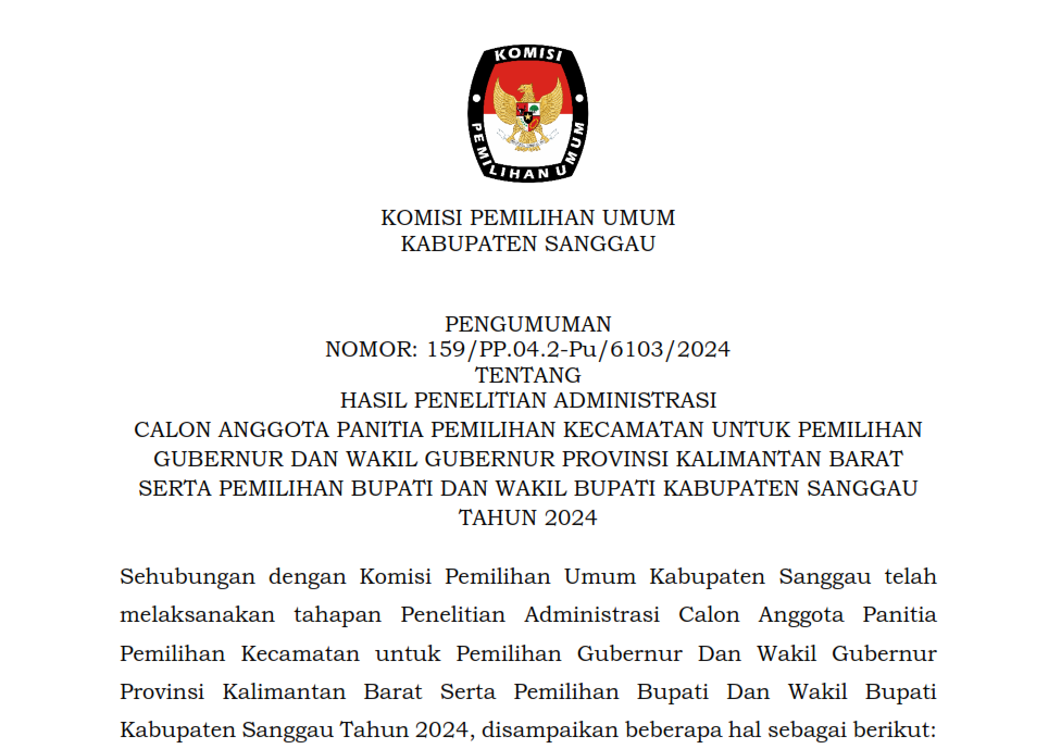 Sanggau, kab-sanggau.kpu.go.id I Berikut disampaikan Pengumuman Komisi Pemilihan Umum Kabupaten Sanggau Nomor: 159/PP.04-Pu/6103/2024 tentang Hasil Penelitian Administrasi Calon Anggota Panitia Pemilihan Kecamatan Untuk Pemilihan Gubernur Dan Wakil Gubernur Provinsi Kalimantan Barat Serta Pemilihan Bupati Dan Wakil Bupati Sanggau Tahun 2024.