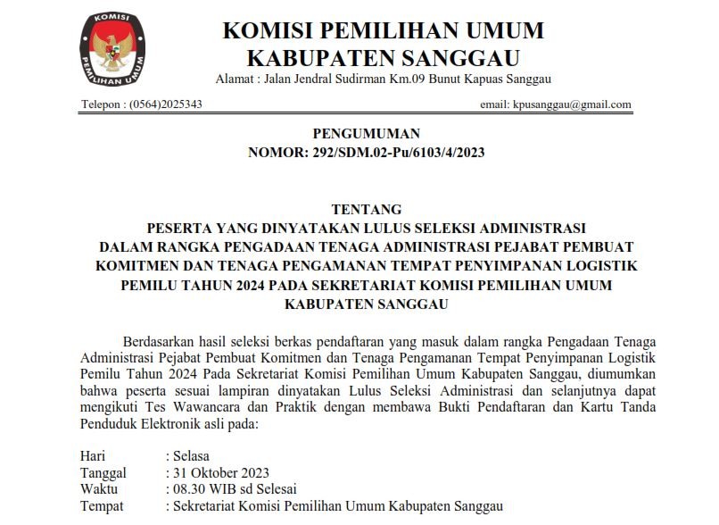 Sanggau, kab-sanggau.kpu.go.id | Berikut disampaikan pengumuman KPU Kabupaten Sanggau Nomor : 292/SDM.02-Pu/6103/4/2023 Tentang Peserta Yang Dinyatakan Lulus Seleksi Administrasi Dalam Rangkapengadaan Tenaga Administrasi Pejabat Pembuat Komitmen Dan Tenaga Pengamanan Tempat Penyimpanan Logistik Pemilu Tahun 2024 Pada Sekretariat Komisi Pemilihan Umum Kabupaten Sanggau.