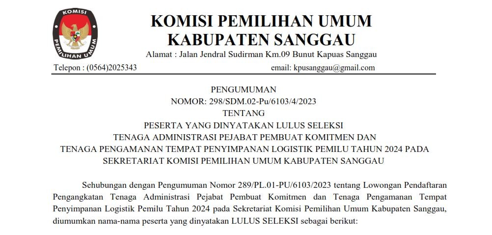 Sanggau, kab-sanggau.kpu.go.id | Berikut disampaikan Pengumuman KPU Kabupaten Sanggau Nomor: 298/SDM.02-Pu/6103/4/2023 tentang Peserta Yang Dinyatakan Lulus Seleksi Tenaga Administrasi Pejabat Pembuat Komitmen Dan Tenaga Pengamanan Tempat Penyimpanan Logistik Pemilu Tahun 2024 Pada Sekretariat Komisi Pemilihan Umum Kabupaten Sanggau.