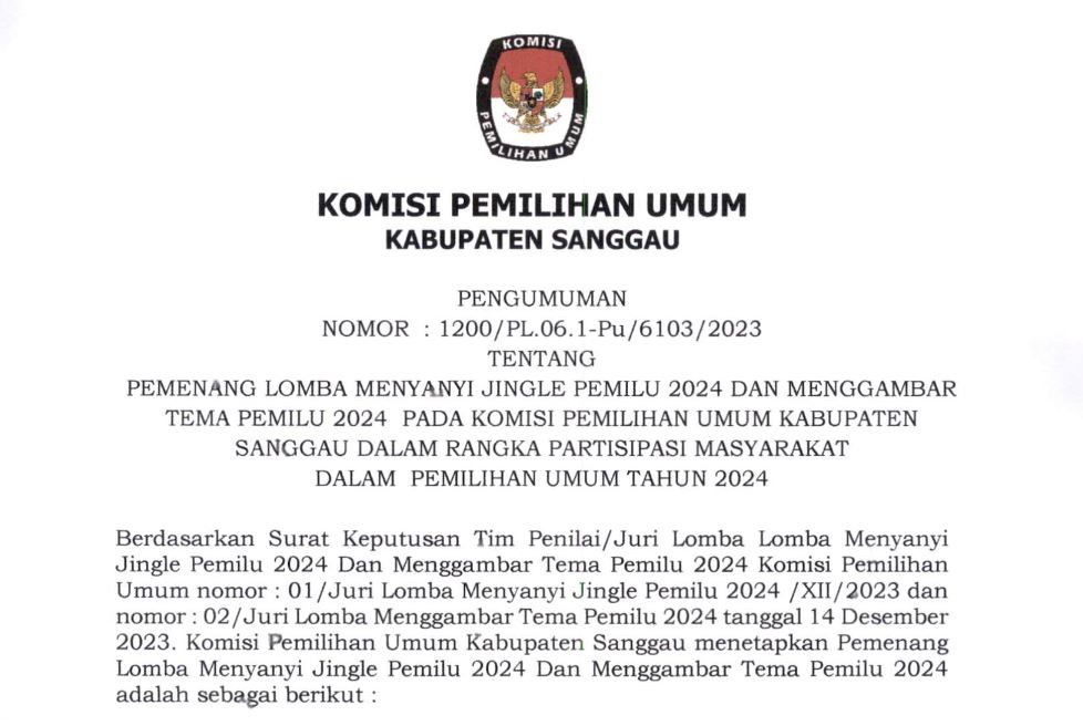 Sanggau, kab-sanggau.kpu.go.id | Berikut disampaikan Pengumuman KPU Kabupaten Sanggau Nomor 1200/PL.06.1-Pu/6103/2023 tentang Pemenang Lomba Menyanyi Jingle Pemilu 2024 dan Menggambar Tema Pemilu 2024 pada Komisi Pemilihan Umum Kabupaten Sanggau dalam rangka Partisipasi Masyarakat dalam Pemilihan Umum Tahun 2024. Seluruh peserta dan pemenang diundang hadir dalam pembagian hadiah yang akan dilaksanakan dalam acara senam sehat, pada hari Minggu, 17 Desember 2023, pukul 06.30 Wib bertempat di halaman Kantor Bupati Sanggau.