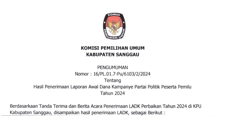Sanggau, kab-sanggau.kpu.go.id | Berikut disampaikan Pengumuman KPU Kabupaten Sanggau Nomor: 16/PL.01.7-Pu/6103//2/2024 tentang Hasil Penerimaan Laporan Awal Dana Kampanye Partai Politik Peserta Pemilu Tahun 2024.