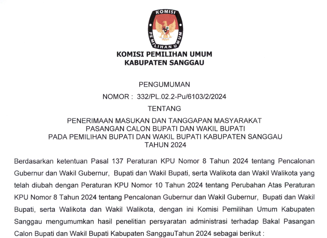 Sanggau, kab-sanggau.kpu.go.id I Berikut disampaikan pengumuman KPU kabupaten Sanggau Nomor 332/PL.02.2-Pu/6103/2024 tentang Penerimaan Masukan dan Tanggapan Masyarakat Pasangan Calon Bupati dan Wakil Bupati Pada Pemilihan Bupati dan Wakil Bupati Sanggau Tahun 2024.