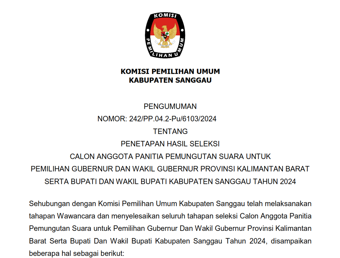 Sanggau, kab-sanggau.kpu.go.id I Berikut disampaikan Pengumuman Komisi Pemilihan Umum Kabupaten Sanggau Nomor: 242/PP.04.2-Pu/6103/2024 tentang Penetapan Hasil Seleksi Calon Anggota Panitia Pemungutan Suara Untuk Pemilihan Gubernur Dan Wakil Gubernur Provinsi Kalimantan Barat Serta Pemilihan Bupati Dan Wakil Bupati Sanggau