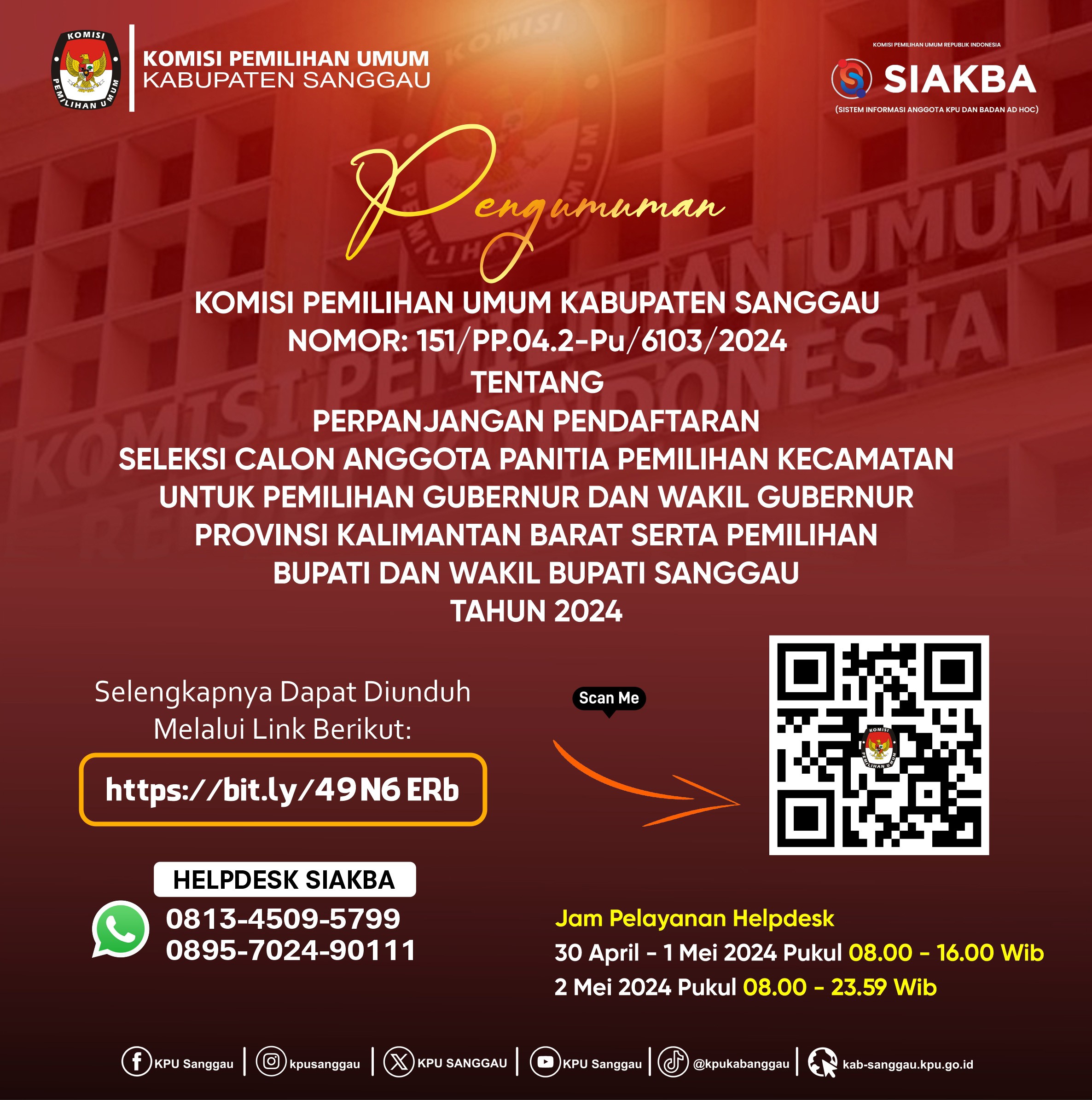 Sanggau, kab-sanggau.kpu.go.id | Berikut disampaikan Pengumuman Komisi Pemilihan Umum Kabupaten Sanggau Nomor: 151/PP.04.2-Pu/6103/2024 tentang Perpanjangan Pendaftaran Seleksi Calon Anggota Panitia Pemilihan Kecamatan Untuk Pemilihan Gubernur Dan Wakil Gubernur Provinsi Kalimantan Barat Serta Pemilihan Bupati Dan Wakil Bupati Sanggau Tahun 2024.