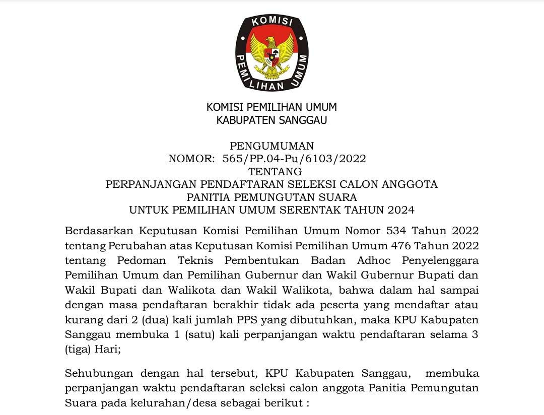 Sanggau, kab-sanggau.kpu.go.id | Berikut disampaikan pengumuman KPU Kabupaten Sanggau Nomor :565/PP.04-Pu/6103/2022 tentang Perpanjangan Pendaftaran Seleksi Calon Anggota Panitia Pemungutan Suara Untuk Pemilihan Umum Serentak Tahun 2024.