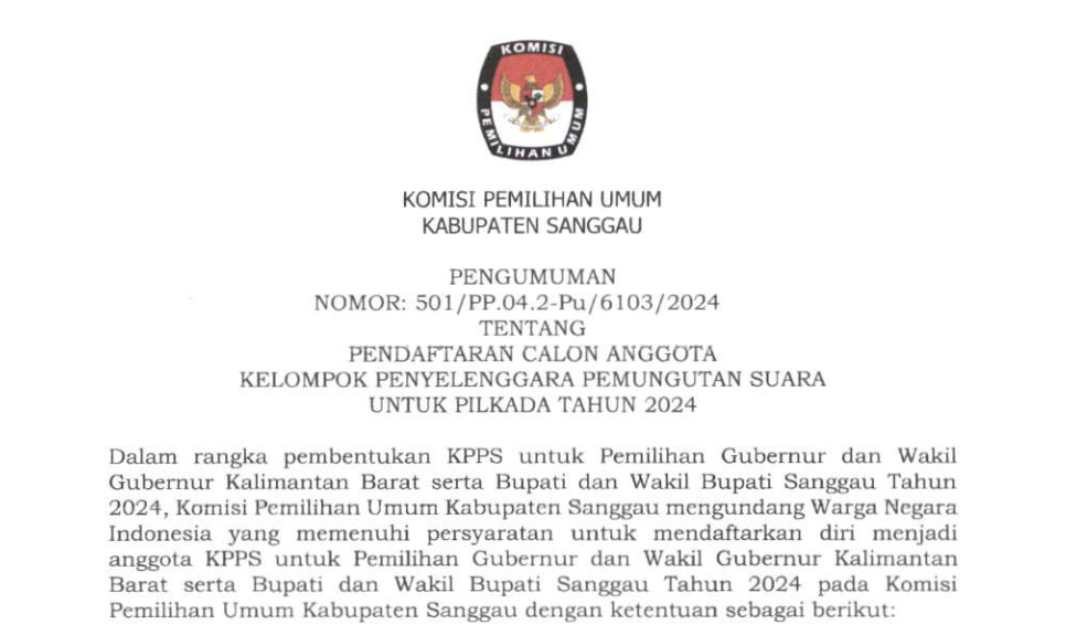 Sanggau, kab-sanggau.kpu.go.id I Berikut disampaikan Pengumuman Komisi Pemilihan Umum Kabupaten Sanggau Nomor 501/PL.04.2-Pu/6103/2/2024 tentang Pendaftaran Calon Anggota kelompok Penyelenggara Pemungutan Suara Pada Pemilihan Serentak Tahun 2024.