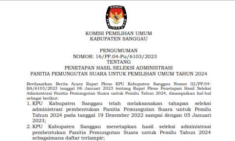 Sanggau, kab-sanggau.kpu.go.id | Berikut disampaikan pengumuman KPU Kabupaten Sanggau Nomor: 16/PP.04-Pu/6103/2023 tentang Penetapan Hasil Seleksi Administrasi Panitia Pemungutan Suara Untuk Pemilihan Umum Tahun 2024.
