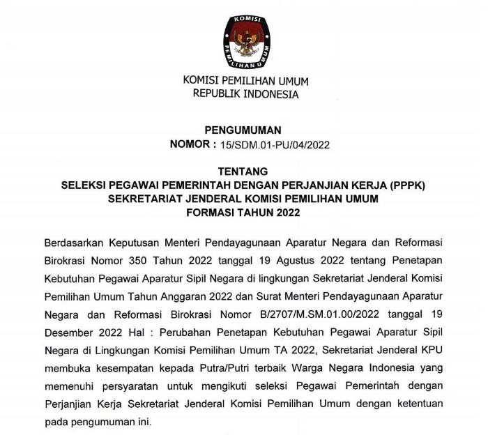 Jakarta, kab-sanggau.kpu.go.id | Berikut disampaikan pengumuman KPU RI Nomor Nomor :15/SDM.01-PU/04/2022 tentang Seleksi Pegawai Pemerintah Dengan Perjanjian Kerja (PPPK) Sekretariat Jenderal Komisi Pemilihan Umum Formasi Tahun 2022.