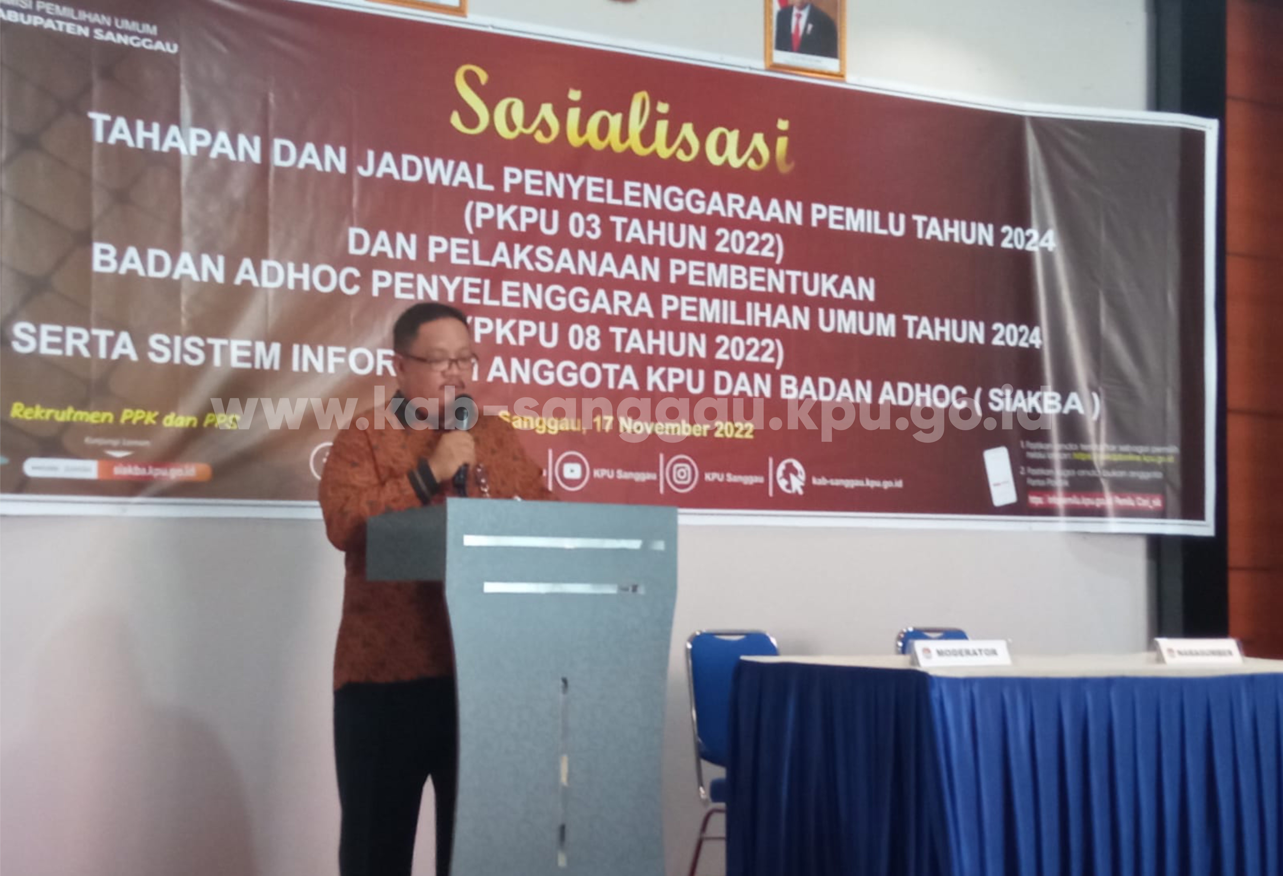 Sanggau, kab-sanggau.kpu.go.id | KPU Kabupaten Sanggau melaksanakan kegiatan Sosialisasi PKPU Nomor 3 Tahun 2022 tentang Tahapan dan Jadwal Penyelenggaraan Pemilu Tahun 2024 dan Sosialisasi PKPU Nomor 6 Tahun 2022 tentang Pembentukan Badan Penyelenggara Ad Hoc Pemilu Tahun 2024 serta pengenalan aplikasi Sistem Informasi Anggota KPU dan Badan Ad Hoc (SIAKBA), yang berlangsung di Hotel Meldy Sanggau, Kamis (17/11/2022) pagi.